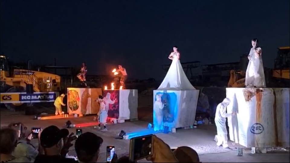 Per quanto riguarda gli spettacoli, tutte le performance in calendario, erano quest’anno ispirate ai 4 elementi naturali che caratterizzano il sistema del pianeta, ovvero l’acqua, la terra, l’aria e il fuoco, al contempo presenti all’interno dei siti dove si estrae e si lavora la pietra millenaria. Particolarmente apprezzate sono state le esibizioni di Mirko Frezza, attore noto e personaggio impegnato nella difficile periferia romana, che ha recitato un monologo e devoluto il cachet alla nobile causa del recupero sociale delle persone dopo la detenzione in carcere, causa portata avanti con il sostegno dell’associazione ‘Il Casaletto’. Mattia Del Forno, musicista, cantante e compositore, ma anche Roberta Castelluzzo, regista; Andrea Di Cesare, violinista, e Anush Castiglione, bravissima performer di arti visive, hanno regalato al pubblico momenti di autentica arte nel connubio con la cava e il bianco del Travertino Romano nella sua versione 4.0.