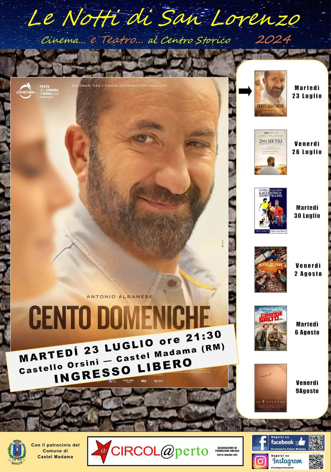 L’associazione di promozione sociale Circol@aperto di Castel Madama organizza una rassegna di cinema, con il patrocinio del comune, presso il Castello Orsini. Il programma prevede: Martedì 23 luglio ore 21 Cento Domeniche di Antonio Albanese Venerdì 26 luglio ore 21 200 metri di Ameen Dayfeh. Anteprime Musiche e Parole a cura di Marco Testi, Giancarlo Ieri […]