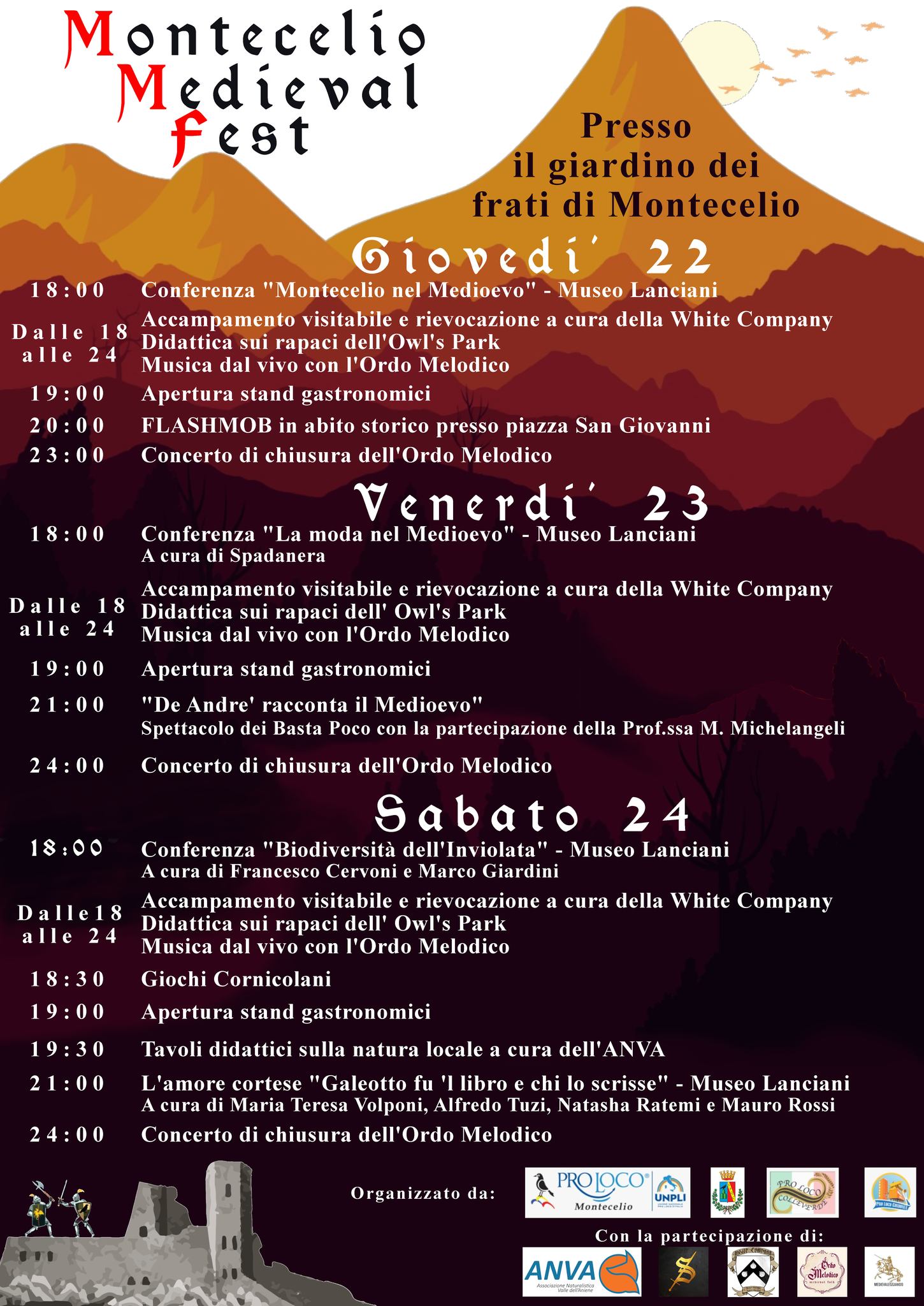 Prima edizione del “Montecelio Medievale Fest” organizzato dalla Proloco con la partecipazione del comune di Guidonia. Dal 22 al24 agosto al Parco dei Frati I visitatori potranno toccare con mano un accampamento militare del XV secolo, ammirare le abilità dei falconieri il tutto sottolineato da musica dal vivo.