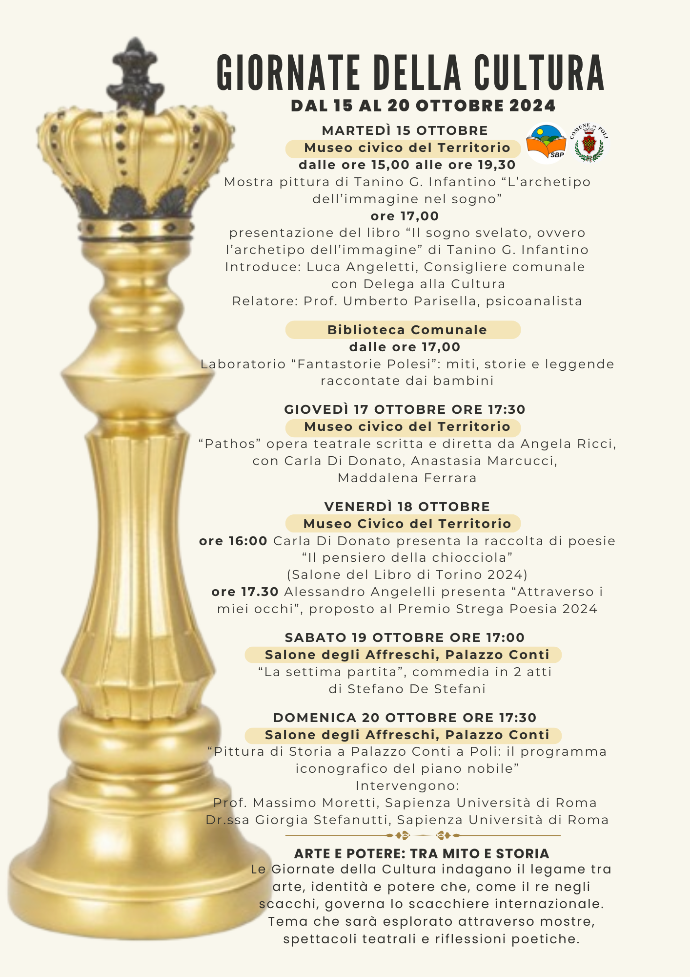 Le “Giornate della Cultura 2024”, in programma a Poli dal 15 al 20 ottobre, propongono per questa edizione un’importante riflessione sul legame tra arte, identità e potere attraverso una serie di eventi che spaziano dalla pittura al teatro, dalla poesia alle attività per i più giovani. L’iniziativa mira a coinvolgere attivamente la comunità in una settimana dedicata alla valorizzazione delle espressioni artistiche e culturali del territorio.