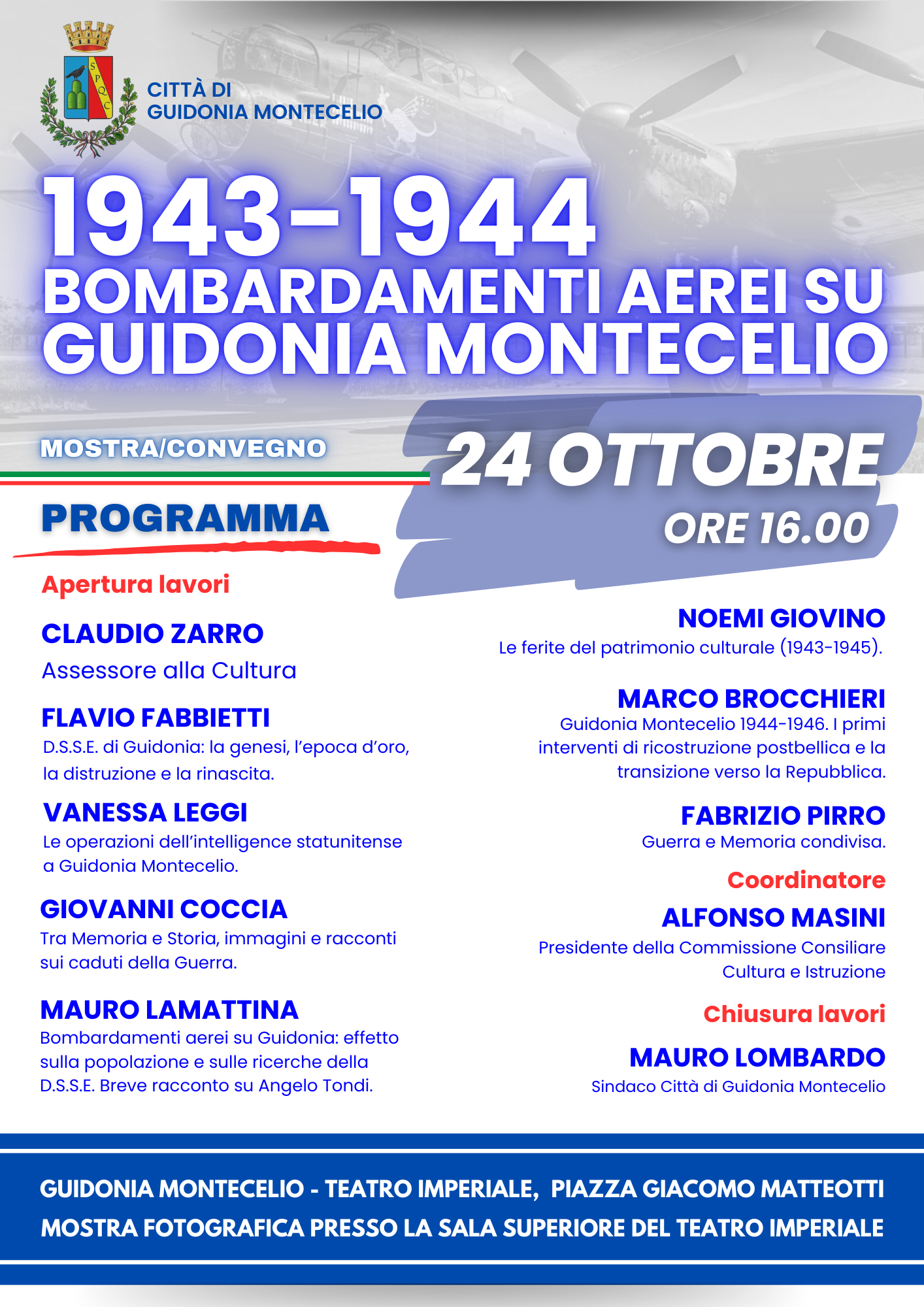 Nell’ambito delle celebrazioni per l’87° Anniversario dell’istituzione del Comune di Guidonia Montecelio, giovedì 24 ottobre alle ore 16:00, presso il Teatro Imperiale, si terrà un convegno dedicato ai bombardamenti aerei che colpirono la Città, tra il 1943 e il 1944, e alla sua storia durante la Seconda Guerra Mondiale e il dopoguerra.