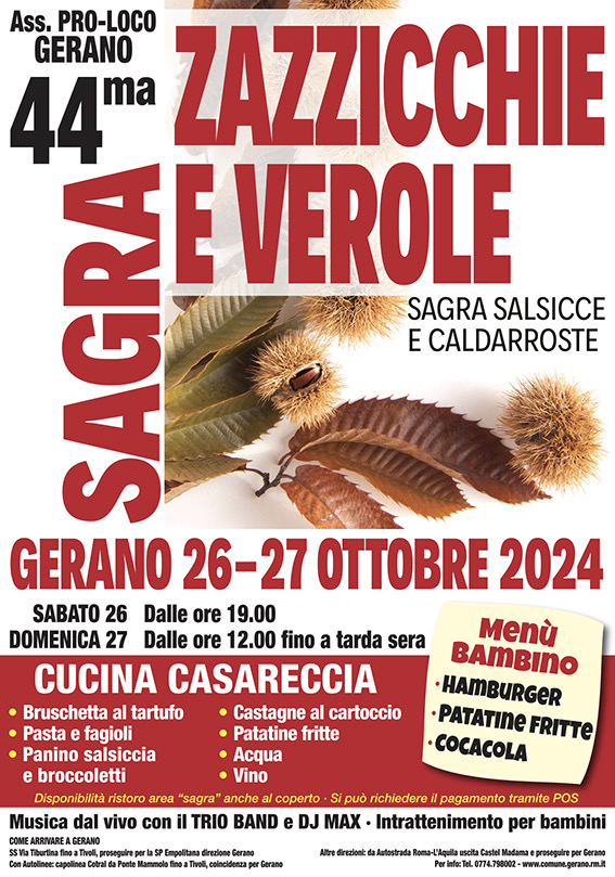 A Gerano sabato 26 e domenica 27 ottobre si svolge per l’edizione 44 la Sagra per assaggiare le tipiche salsicce e caldarroste. Alla Sagra delle Zazzicchie e Verole è possibile gustare un ricco menù, con piatti tipici geranesi e ottimo vino. L’evento è accompagnato da musica dal vivo e intrattenimento per bambini. Per l’occasione si possono programmare visite guidate a Gerano al Museo dell’infiorata, la più antica d’Italia, e al caratteristico Museo delle Scatole di Latta.