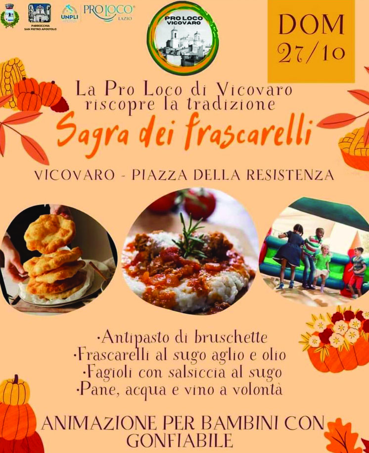 La Pro Loco di Vicovaro ha organizzato per domenica prossima, 27 ottobre, a Piazza della Resistenza (parcheggio della banca), la sagra dei frascarelli. Il menù del pranzo: antipasto di bruschette, frascarelli al sugo aglio e olio, fagioli con salsiccia al sugo, pane, acqua e vino. Per merenda verranno preparate deliziose pizze fritte. Sono previsti inoltre: animazione per bambini con gonfiabili, musica dal vivo con Marco Romano, e il concorso fotografico “Vicovaro nel tempo”. Da questa competizione… all’ultimo scatto saranno scelte le foto che finiranno sul “Calendario vicovarese” 2025.