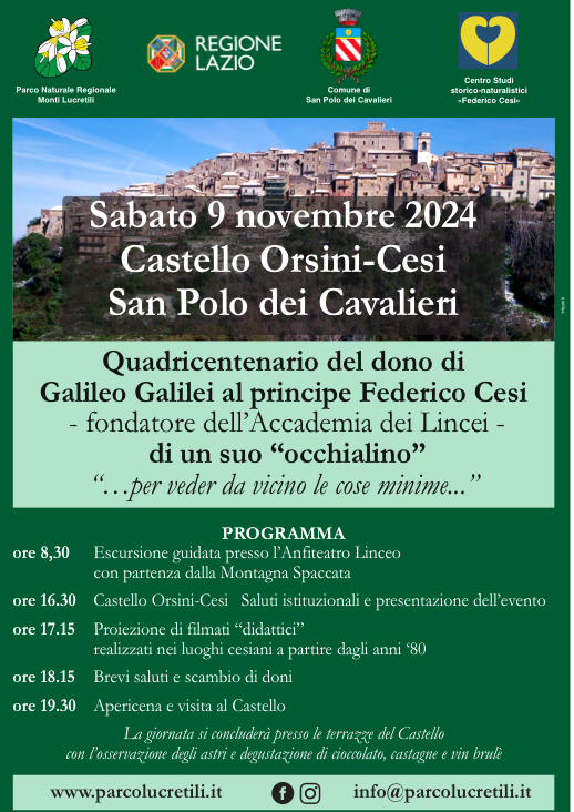 Nel quarto Centenario del dono di Galileo Galiei a Federico Cesi, fondatore dell’Accadenia dei Lincei, di un occhialino l’Ente Parco Naturale dei Monti Lucretili con il Centro studi storico-naturalistici «Federico Cesi’ e il comune di San Polo dei Cavalieri organizza un convegno dal titolo Quadricentenario del dono di