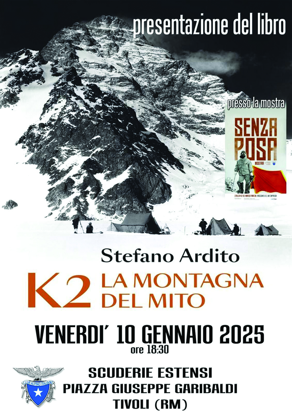 Venerdì 10 gennaio – apertura spazio espositivo dalle 15:00 alle 20:00. Alle ore 18:30, presentazione del libro “La montagna del mito” a cura dell’autore, Stefano Ardito. «Presentare i miei libri – afferama l’autore – a Tivoli è sempre un piacere. Lo sarà ancora una volta il 10 gennaio prossimo, quando racconterò agli alpinisti e agli escursionisti tiburtini del mio lavoro dedicato al K2, e alle tante spedizioni che lo hanno tentato e salito negli anni.»
