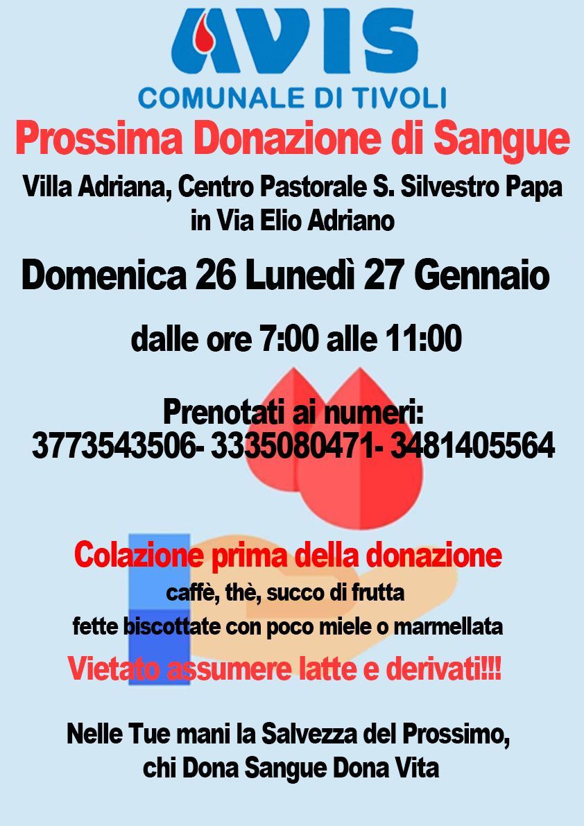 L’AVIS comunale di Tivoli promuove due giornate per la donazione di sangue: domenica 26 e lunedì 27 gennaio 2025 dalle ore 7:00 alle ore 11:00 nel Centro Pastorale S. Silvestro papa (Via Elio Adriano) a Villa  Adriana.