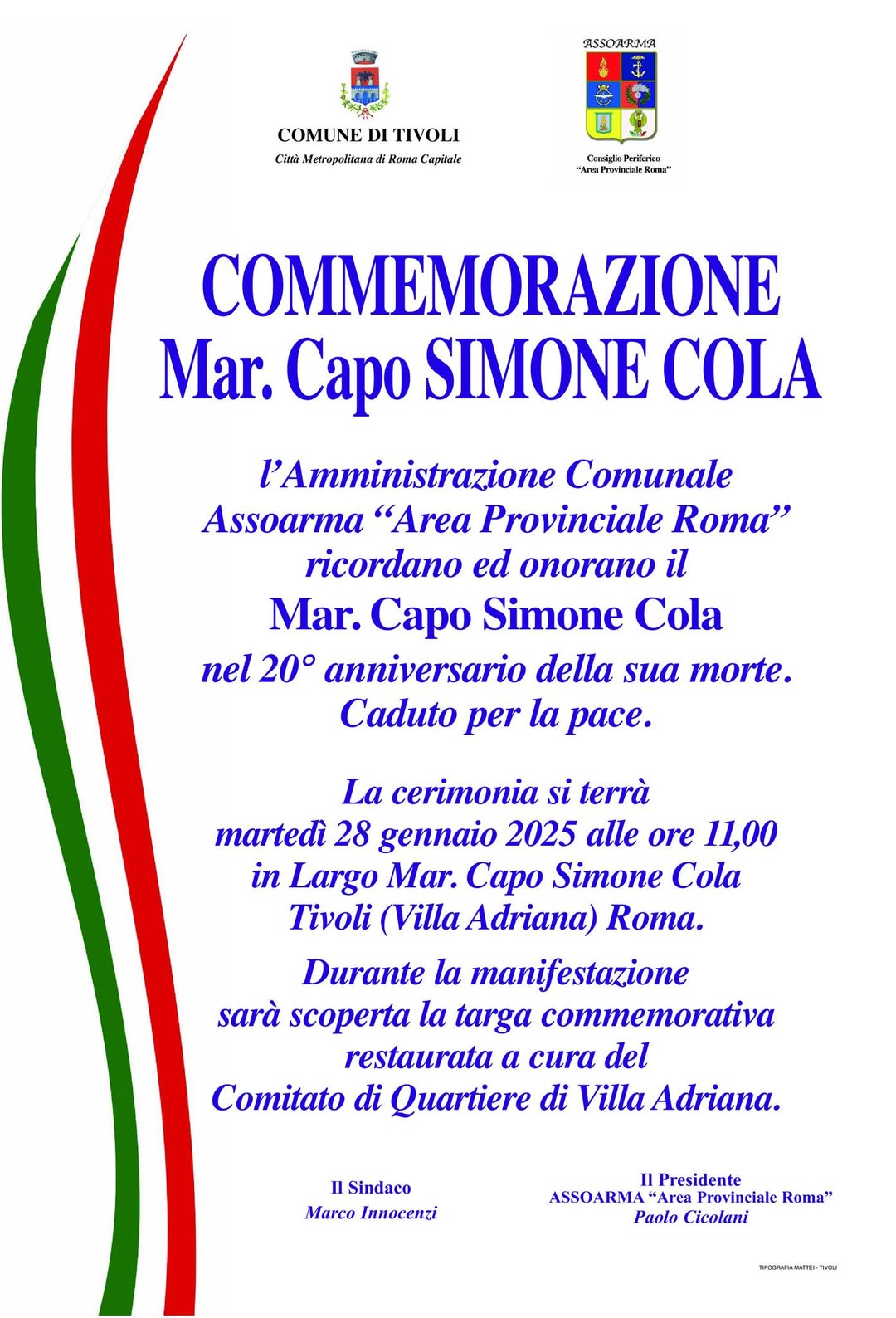In ricordo di Simone Cola Martedì 28 gennaio, Tivoli ricorderà, a vent’anni dalla sua scomparsa, il Mar. Capo Simone Cola scomparso dopo un attentato in Iraq dove era in missione di pace. «Un nostro concittadino – ha scritto il sindaco di Tivoli Marco Innocenzi – che ha dimostrato coraggio, portando il suo impegno per la Pace in terre lontane, dando la sua vita per proteggerne altre.