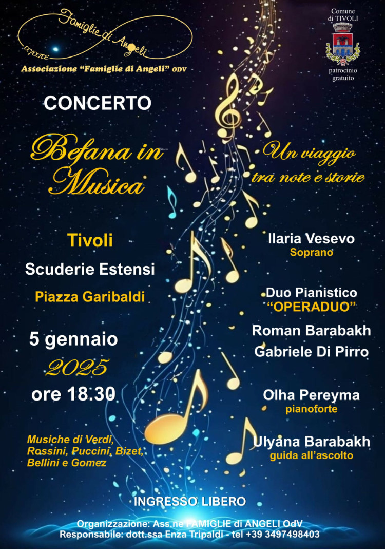Promosso e organizzato dall’Associazione Famiglie di Angeli si terrà a domenica 5 gennaio 2025 alle ore 18.30, a Tivoli presso le Scuderie Estensi il Concerto Befana in musica: un viaggio tra note e storie, una magia di musica per tutti. L’esecuzione del concerto è affidata a giovani musicisti di talento: al soprano Ilaria Vesevo, accompagnata al pianoforte dal maestro Olha Pereyma, al […]