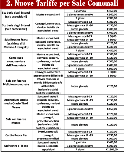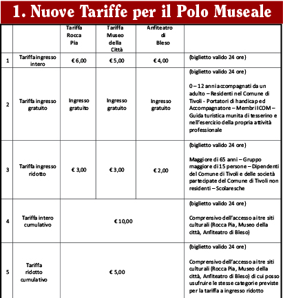 Con delibera della Giunta comunale 249 del 28 novembre 2024 a partire dall’anno 2025 il Comune di Tivoli ha provveduto all’aumento delle tariffe per vari servizi e concessioni tra cui le nuove quote per l’ingresso al Museo Civico, alla Rocca Pia e all’anfiteatro di Bleso e per la concessone delle sale comunali.