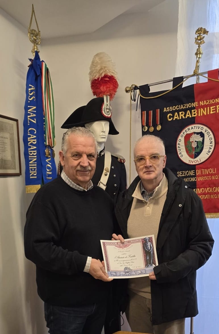 Sabato 8 febbraio, il presidente dell’ANC di Tivoli, Luogotenente Rolando Torti nella sede sociale di Largo Salvo d’Acquisto, 25 ha consegnato gli attestati di merito ai seguenti iscritti: Luogotenente Elio Filippi, già comandante del Nucleo Comando della Compagnia di Tivoli, Brigadiere Alberto D’Angelo; Carabiniere Daniele Proietti e ai soci simpatizzanti, signori: Massimiliano Marino, Raffaele Berti, Giuseppe Coccanari, Carlo Valentini, Vincenzo Mattei, Mauro Cascini e signora Silvana Battista.