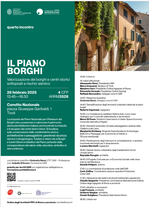 Venerdì 28 Febbraio 2025 alle ore 13.45 si terrà presso l’Aula Magna del Convitto Nazionale sito in piazza Garibaldi Tivoli, il seminario su “Il piano borghi, valorizzazione del borghi e centri storici sottoposti a rischio sismico” organizzato dall’Ordine degli Architetti di Roma, dalla Commissione Città Metropolitana zona 5, in collaborazione con l’Ordine Ingegneri di Roma e con l’Ordine Geologi del Lazio.