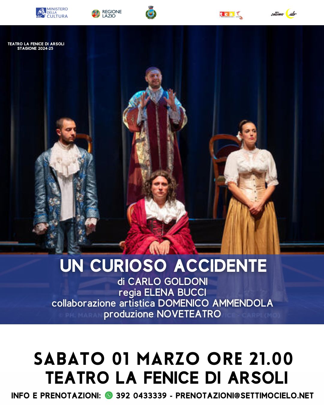 Sabato 1° marzo ore 21 il teatro La Fenice di Arsoli si congiunge idealmente a Venezia ospitando una delle opere più interessanti del repertorio di Carlo Goldoni “Un curioso accidente” con Andrea Avanzi, Matteo Baschieri, Mattia Biasotti, Sabina Borelli, Silvia Gandolfi, Paolo Zaccaria. Regia Elena Bucci