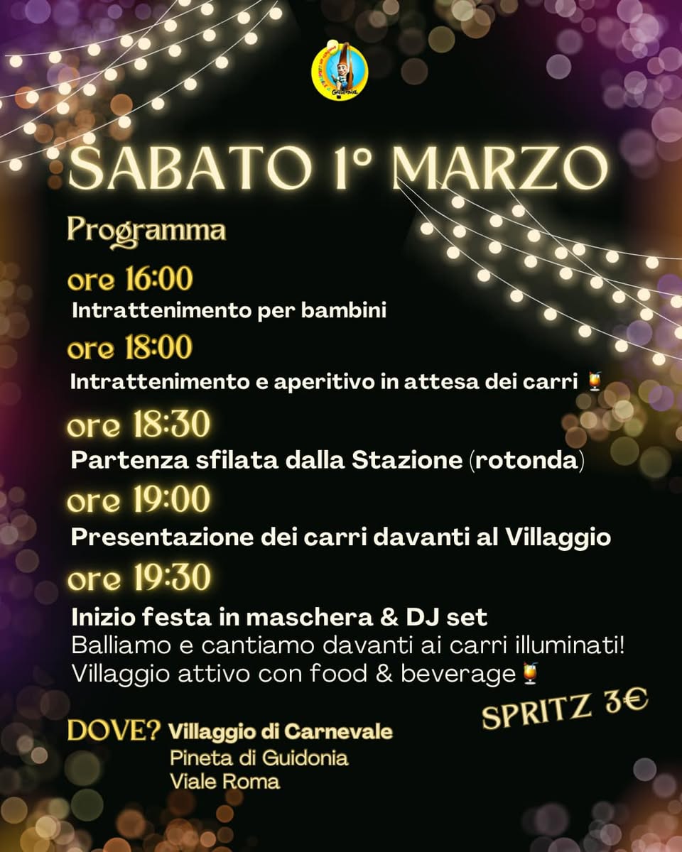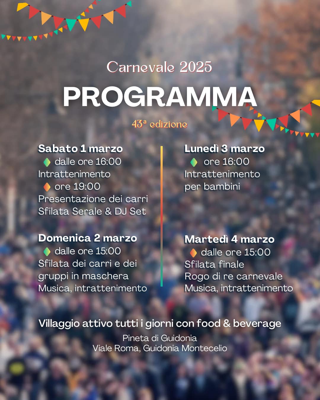 Sabato 1° marzo, ore 16 intrattenimento; ore 19 Presentazione dei Carri, sfilata e DJ set; Domenica 2 marzo dalle ore 15 Sfilata dei carri e dei gruppi in maschera, musica e intrattenimento. Lunedì 3 marzo ore 16 intrattenimento per bambini. Martedì 4 marzo dalle ore 15 sfilata finale, rogo del carnevale, musica, intrattenimento. Villaggio attivo tutti i giorni con food e beverage nella Pineta di Guidonia in via Roma.