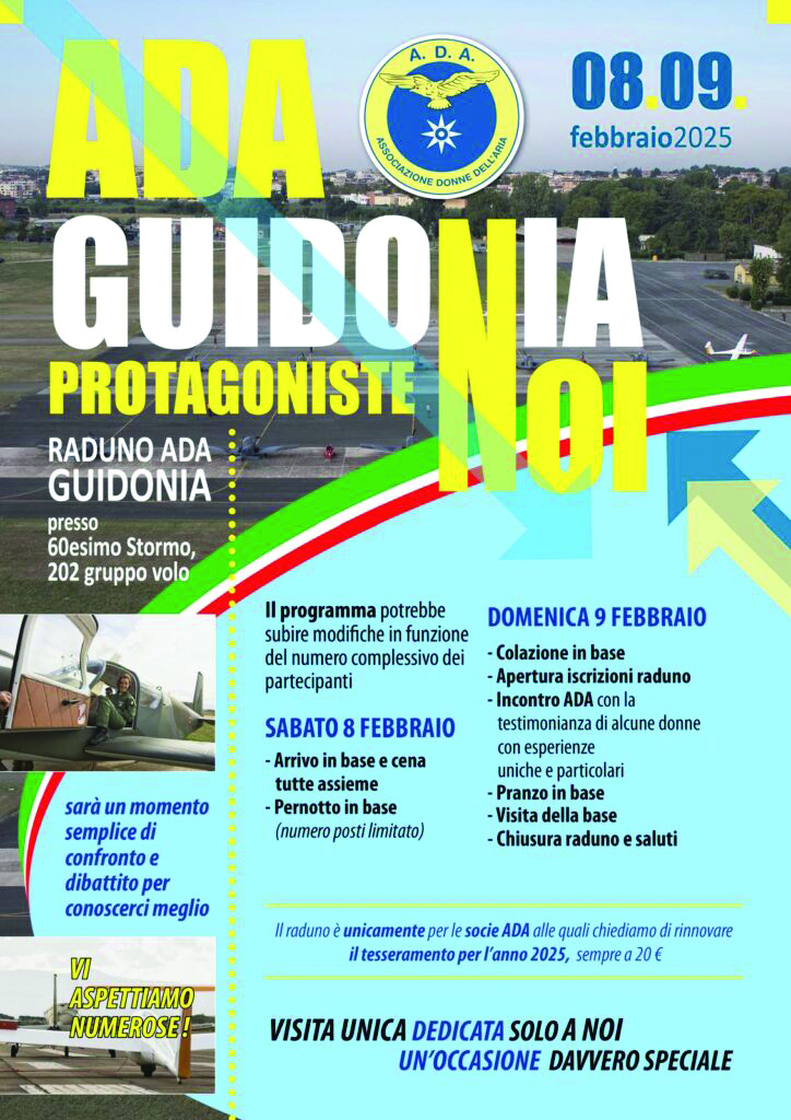 L’Aeroporto Militare Alfredo Barbieri di Guidonia ospiterà il Raduno dell’ADA (Associazione Donne dell’Aria) nei giorni 8 e 9 Febbraio 2025. L’evento che ADA sta programmando si svolgerà dal pomeriggio di sabato 8 febbraio, con l’arrivo delle partecipanti nella base che gentilmente ha fornito la logistica per il raduno, loro sistemazione nella struttura alberghiera convenzionata, cena di benvenuto con la […]