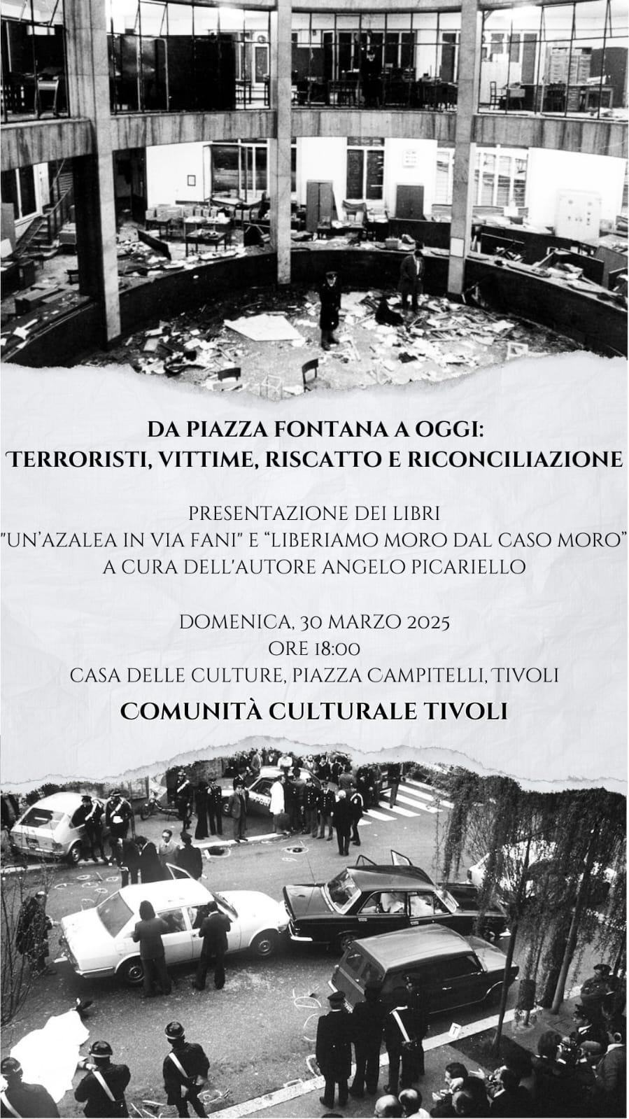 Domenica 30 marzo alle ore 18, la Comunità Culturale Tivoli organizza presso la Casa delle Culture in Piazza Campitelli un incontro dal titolo “Da Piazza Fontana ad oggi. Terrorismo, vittime, riscatto e riconciliazione”, con la partecipazione del giornalista parlamentare Angelo Picariello.
