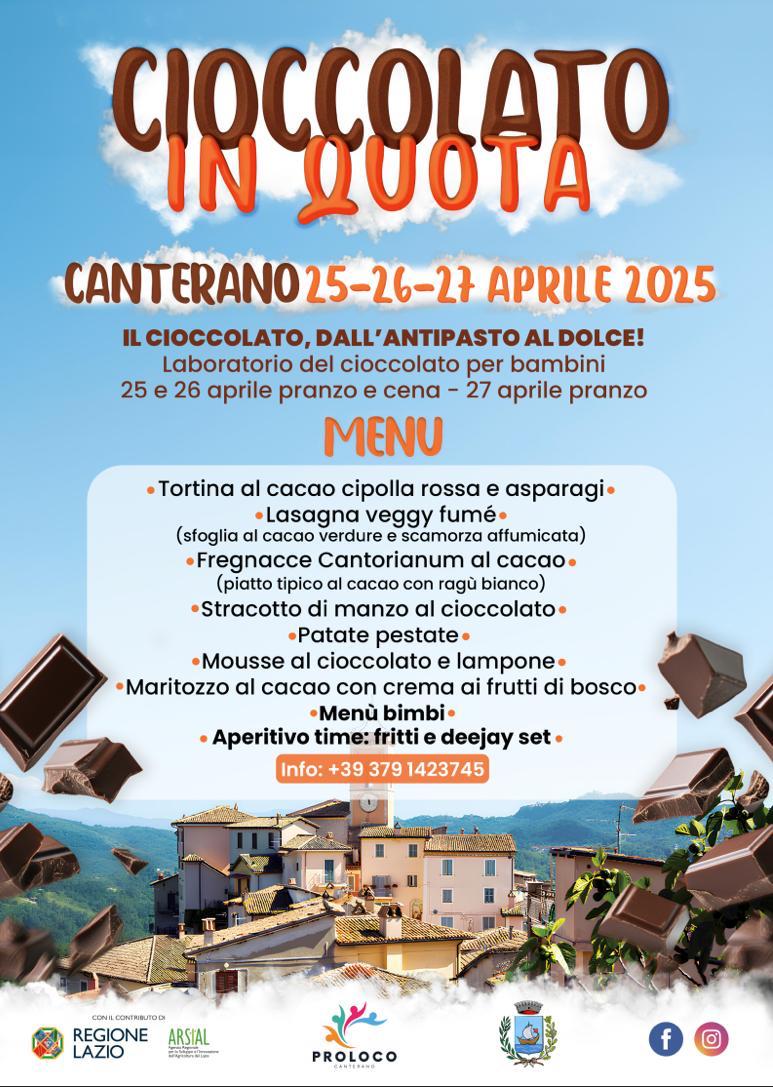 Un’occasione imperdibile per scoprire Canterano, assaporare piatti straordinari e lasciarsi conquistare dalla magia del cioccolato. Cioccolato in Quota vi aspetta per un weekend indimenticabile, dove gusto, tradizione e divertimento si incontrano in un borgo da sogno.