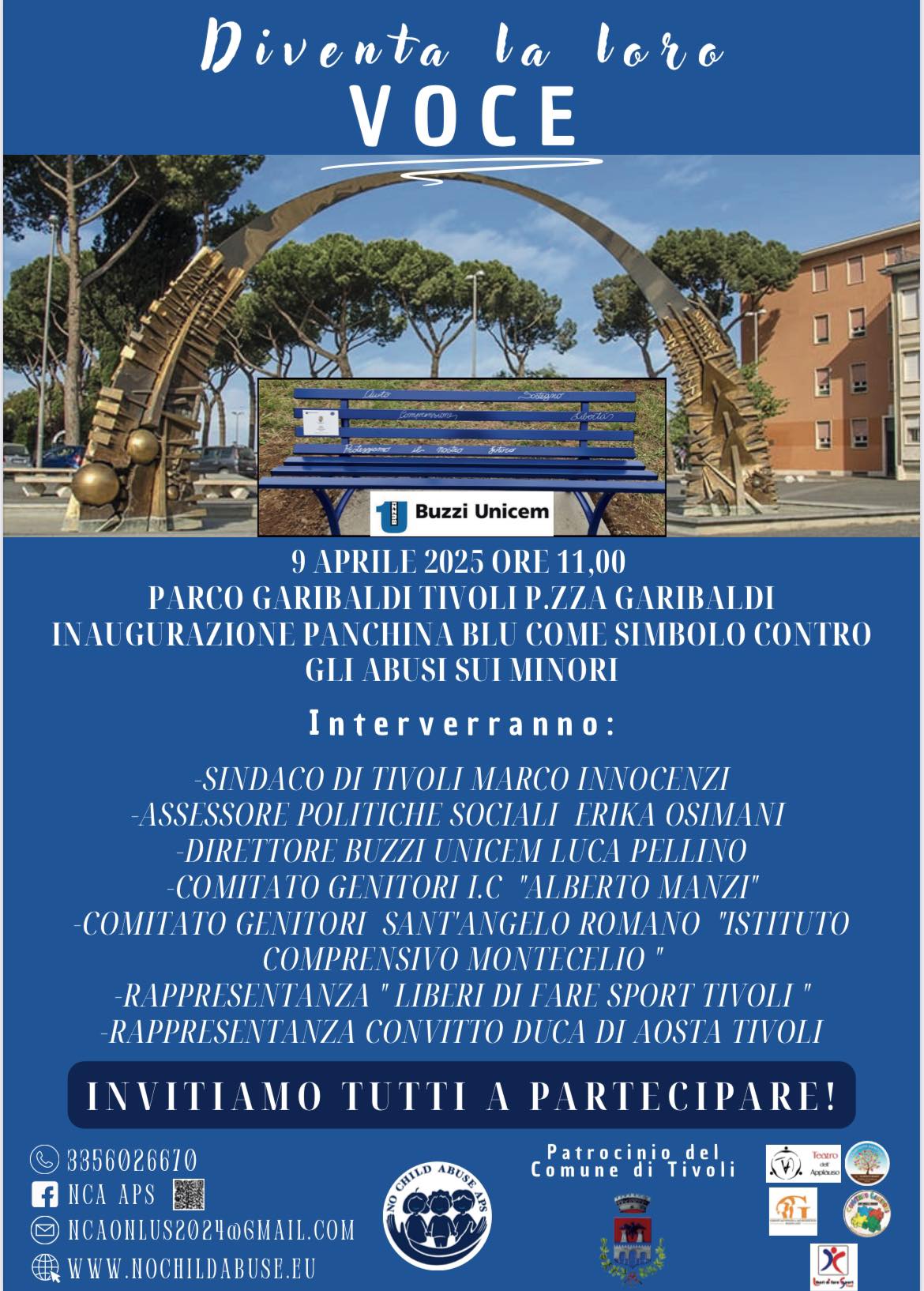 Il Comune di Tivoli e l’Associazione No Child Abuse APS invitano mercoledì 9 aprile alle ore 11 la cittadinanza all’inaugurazione di una panchina blu, simbolo di speranza, protezione e impegno nella lotta contro gli abusi sui minori.
