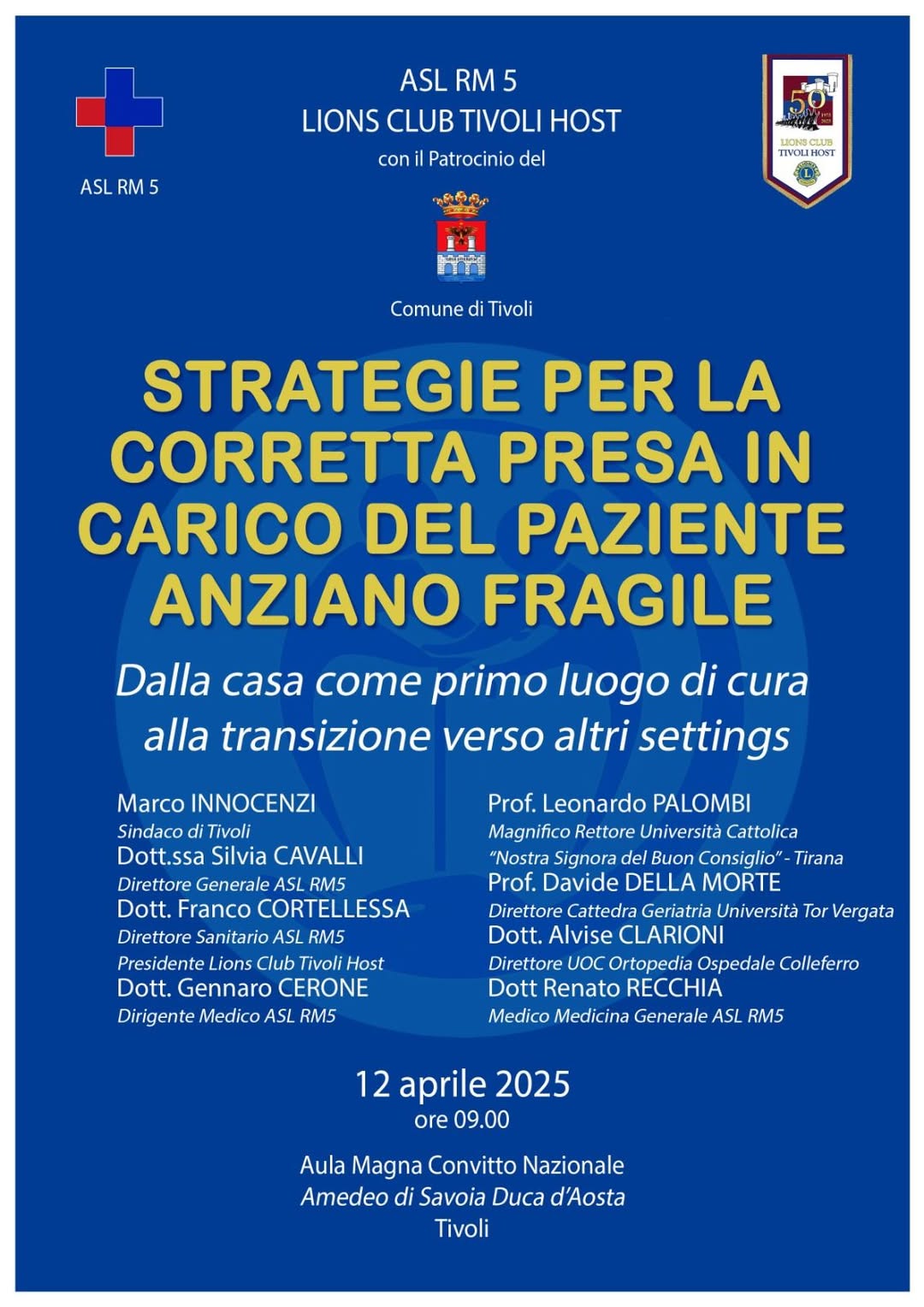 Il Lions Club Tivoli Host insieme all’ASL RM 5 organizzano, sabato 12 aprile alle ore 9,00 presso l’Aula Magna del Convitto Nazionale Amedeo di Savoia Duca d’Aosta a Tivoli, il convegno su “Strategie per la corretta presa in carico del paziente anziano fragile” dalla casa come primo luogo di cura alla transizione verso altro settings.