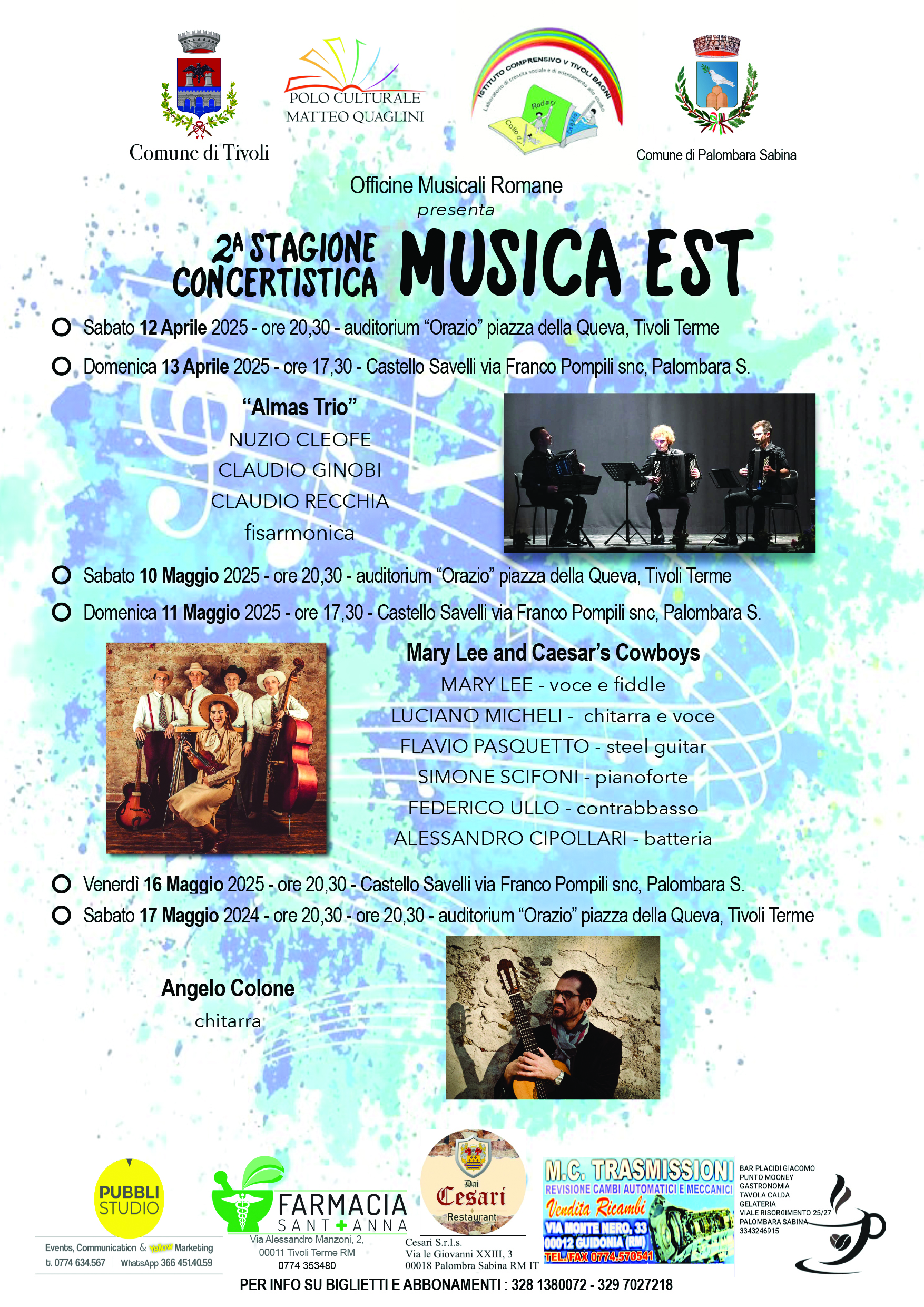 I prossimi appuntamenti prevedono un tuffo nel western swing del gruppo Mary Lee and Caesar’s Cowboys, che si esibirà il 10 maggio a Tivoli Terme e il giorno successivo a Palombara, e le raffinate suggestioni del chitarrista Angelo Colone, che calcherà il palco di Castello Savelli il 16 maggio replicando nell’Auditorium di Tivoli Terme il giorno 17.