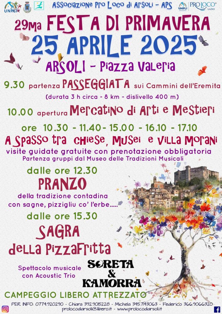 Il 25 aprile ad Arsoli torna l’atteso appuntamento con la Festa della Primavera e la Sagra della Pizzafritta, una giornata ricca di eventi dedicati alla tradizione, alla cultura e ai sapori autentici del territorio.