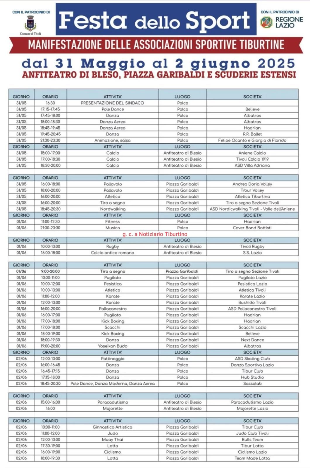 Dal 31 maggio al 2 giugno 2025, Tivoli sarà il palcoscenico della Festa dello Sport, una tre giorni dedicata all’attività sportiva, alla cultura e alla partecipazione cittadina.