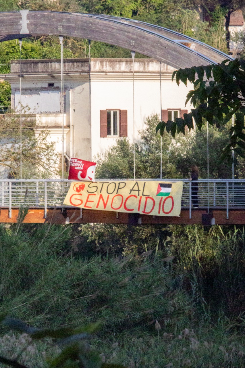 Nel pomeriggio del 23 giugno, la Rete degli Studenti Medi di Tivoli ha esposto uno striscione sul Ponte della Pace per denunciare il genocidio in corso in Palestina e invitare la cittadinanza a partecipare alla mobilitazione prevista per il 25 giugno.
