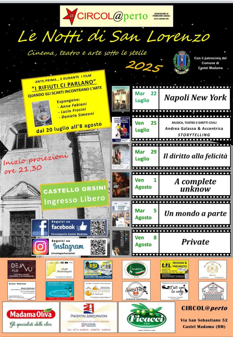 Anche quest’anno, il suggestivo scenario del Castello Orsini di Castel Madama si trasforma in un’arena culturale a cielo aperto con l’attesissima rassegna “Le Notti di San Lorenzo”, promossa dall’associazione CIRCOL@perto con il patrocinio del Comune di Castel Madama. Dal 22 luglio all’8 agosto 2025, il pubblico potrà godersi cinema d’autore, teatro e storytelling completamente gratuiti, […]