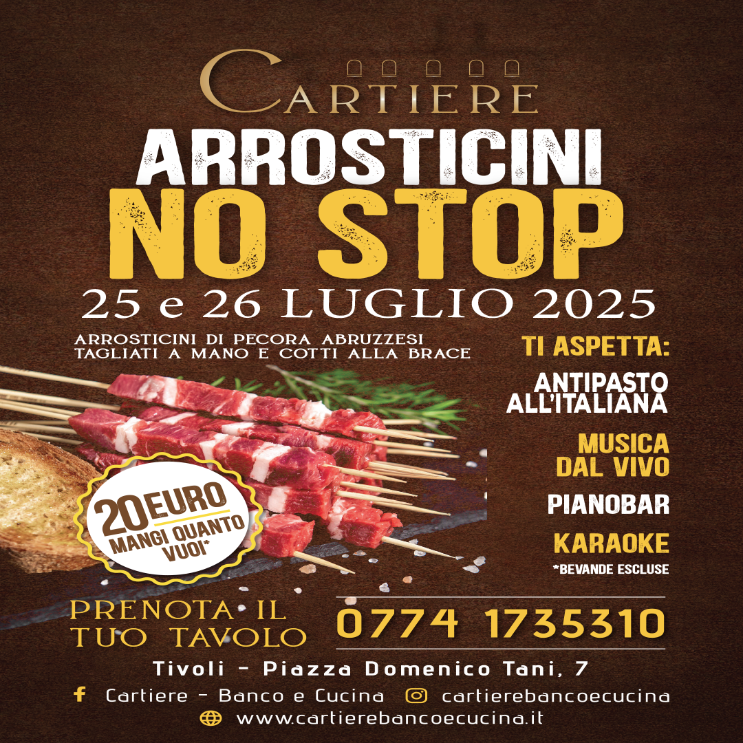 Il 25 e 26 luglio 2025, a Tivoli, l’appuntamento è con la tradizione gastronomica abruzzese: Cartiere – Banco e Cucina, situato in Piazza Domenico Tani 7, organizza due serate dedicate agli amanti degli arrosticini, uno dei simboli più amati della cucina del centro Italia. L’evento, dal titolo “Arrosticini No Stop”, propone una formula “all you […]