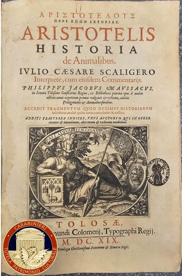 Riconsegnato dai Carabinieri ARISTOTELIS HISTORIA DE ANIMALIBUS