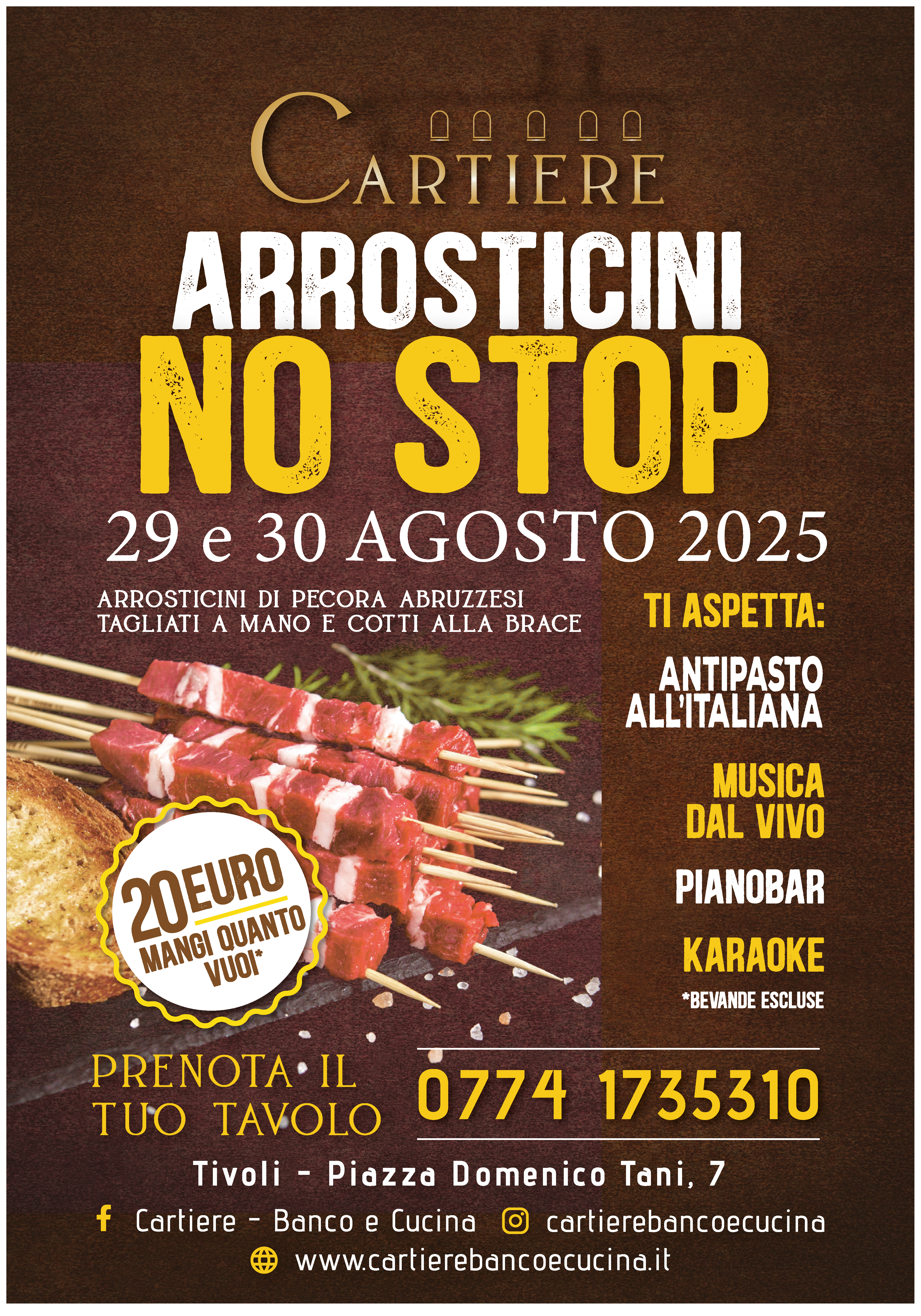 Due serate dedicate ai sapori autentici della tradizione abruzzese: il 29 e 30 agosto 2025, il ristorante Cartiere – Banco e Cucina di Tivoli organizza l’evento “Arrosticini No Stop”, una festa gastronomica per tutti gli amanti della carne alla brace.