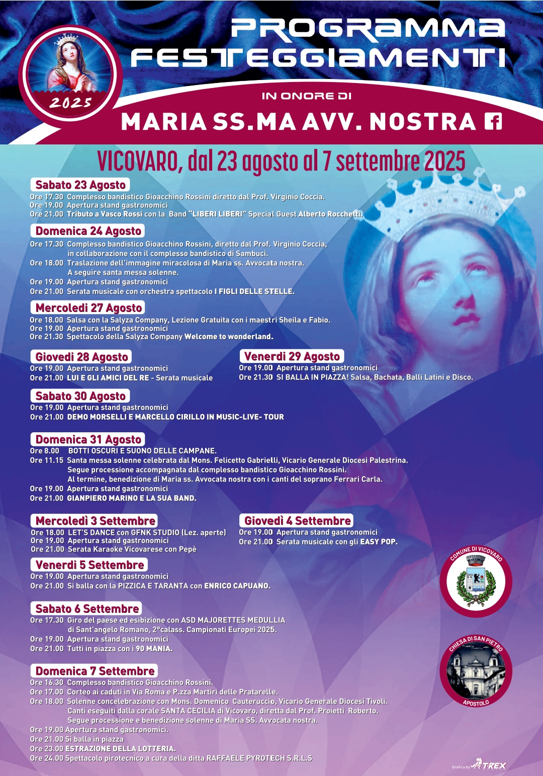 La festa patronale di Maria SS.ma Avvocata Nostra non è solo fede e tradizione: è anche un grande palco a cielo aperto che, dal 23 agosto al 7 settembre 2025, porterà a Vicovaro musica per tutti i gusti, trasformando le piazze in luoghi di incontro e divertimento.