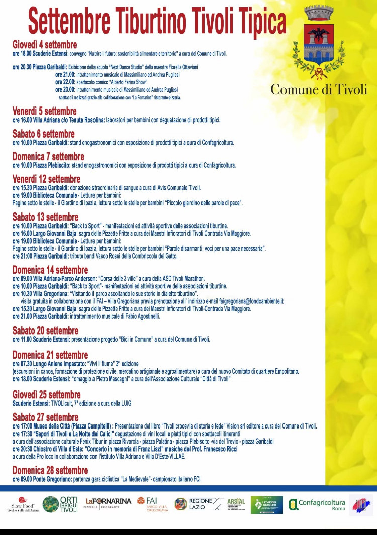 Il Comune di Tivoli celebra le sue eccellenze storiche, culturali ed enogastronomiche con la nuova edizione del “Settembre Tiburtino Tivoli Tipica”, un ricco calendario di eventi che anima la città per tutto il mese. Convegni, laboratori per bambini, degustazioni, spettacoli, sport e mostre accompagneranno cittadini e turisti in un viaggio tra tradizione e innovazione, nel cuore della Tiburtina.