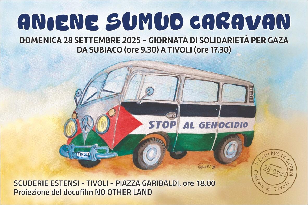 Un’intera giornata per dire “Stop al genocidio” e chiedere pace e giustizia per il popolo palestinese. È questo il messaggio forte e chiaro della Aniene Sumud Caravan, che attraverserà la Valle dell’Aniene domenica 28 settembre, in una grande manifestazione itinerante di solidarietà, impegno civile e mobilitazione dal basso. Il corteo partirà da Subiaco alle ore 9:30, per arrivare a Tivoli alle 17:30, attraversando una serie di comuni del territorio – Agosta, Marano, Arsoli, Roviano, Anticoli Corrado, Cineto Romano, Vicovaro e Castel Madama – con tappe pubbliche in piazza e momenti di incontro con la cittadinanza. A conclusione della giornata, alle ore 18:00, presso le Scuderie Estensi di Tivoli (Piazza Garibaldi), verrà proiettato il docufilm “No Other Land”, vincitore dell’Oscar 2025 per i documentari, che racconta la resistenza quotidiana e la lotta nonviolenta dei palestinesi sotto occupazione militare. Il docufilm è stato realizzato da un’équipe israelo-palestinese.