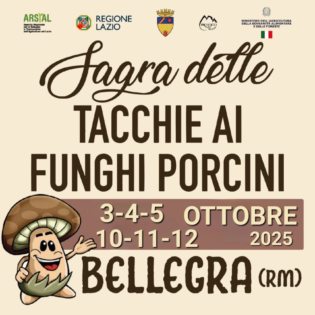 A Bellegra inizia la 17^ Sagra delle Tacchie ai Funghi Porcini dal 3 al 5 ottobre e dal 10 al 12 ottobre 2025, due weekend per festeggiare due prodotti tipici della cucina bellegrana.