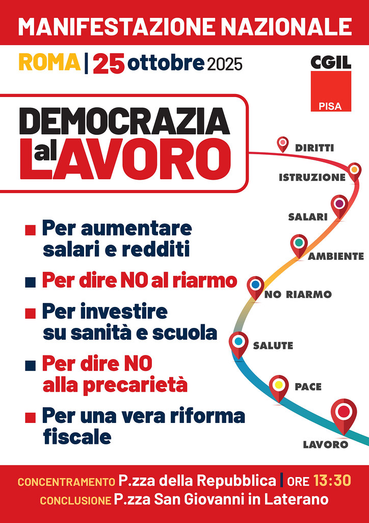 “Sabato 25 ottobre saremo in piazza per la grande manifestazione nazionale della Cgil ‘Democrazia al Lavoro’ per aumentare salari e pensioni e per dire no alla guerra, al riarmo e alla precarietà. Per una vera riforma fiscale che alleggerisca chi vive di lavoro e pensione e per investire in sanità e scuola pubblica, pilastri della […]