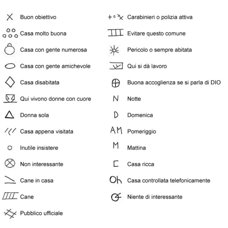 Alcuni segni ricorrono più spesso di altri. Una “M” può indicare che l’abitazione è libera la mattina, mentre una “N” suggerisce un orario favorevole notturno. Un triangolo o una scala stilizzata segnalano la presenza di un cane, mentre un cerchio sbarrato può indicare una casa già visitata e ritenuta poco interessante.