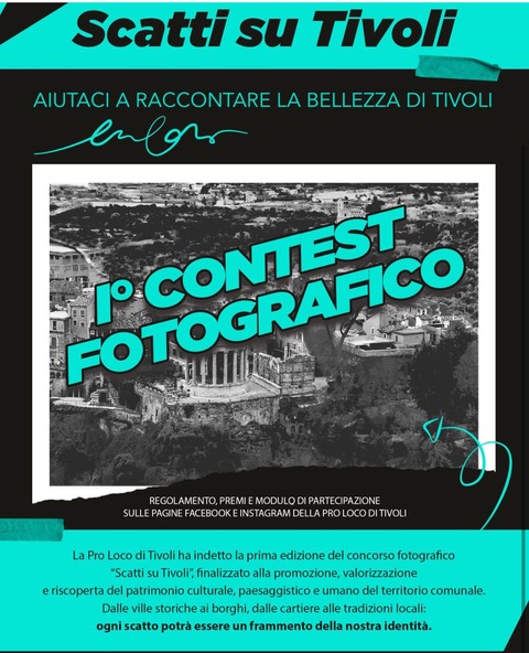 La Pro Loco di Tivoli presenta con entusiasmo la prima edizione del concorso fotografico “Scatti su Tivoli”, un invito aperto a tutti – cittadini, turisti, amatori e professionisti – per raccontare la città attraverso l’obiettivo. L’iniziativa punta a valorizzare la bellezza di Tivoli in tutte le sue forme: paesaggi, scorci nascosti, tradizioni, persone e momenti di vita quotidiana. Nessun limite di […]