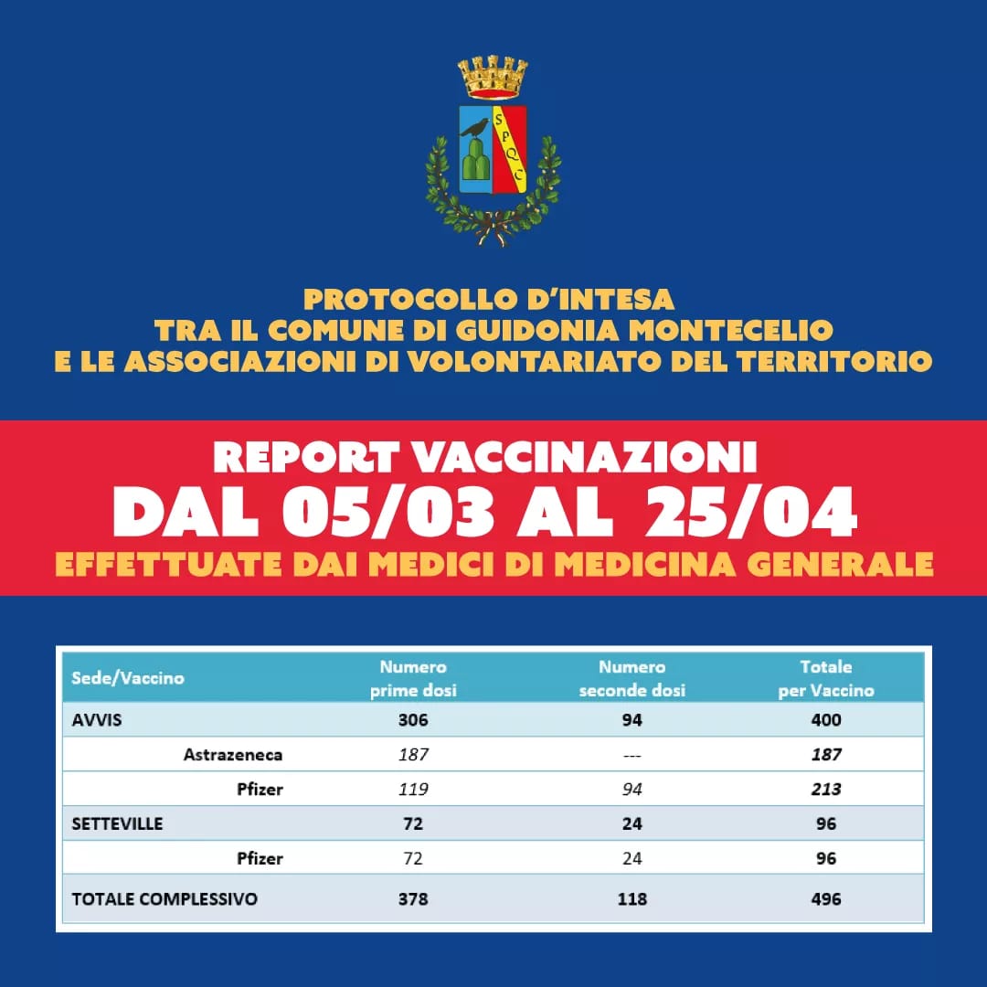 Sono 496 le vaccinazioni eseguite dai 10 medici di medicina generale all’interno dei due punti vaccinali di Villalba e Setteville nel periodo dal 5 marzo al 25 aprile. I punti vaccinali sono stati aperti dopo la convenzione tra il Comune di Guidonia Montecelio e le associazioni Airte, Avvis, Croce Rossa Italiana Guidonia Montecelio, Le Cento […]