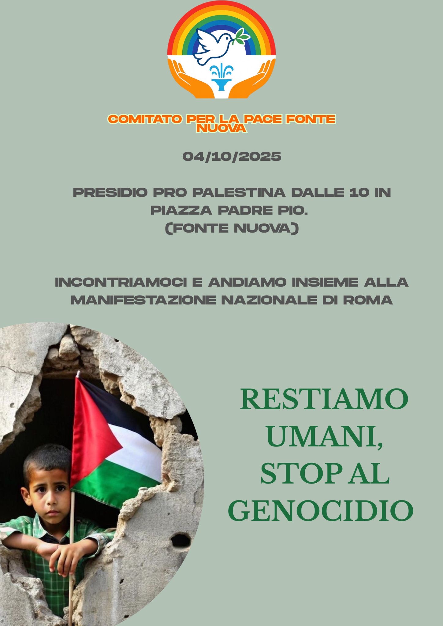 Fonte Nuova – Domani, sabato 4 ottobre, Piazza Padre Pio ospiterà un presidio pro Palestina promosso dal Comitato per la pace di Fonte Nuova. L’appuntamento, fissato per le ore 10, vuole richiamare l’attenzione della cittadinanza sulla crisi in corso nella Striscia di Gaza e sulla detenzione in Israele degli attivisti della “Global Sumud Flotilla”, la […]