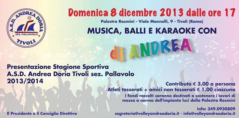 Presentazione della squadra 2013-2014 e raccolta fondi per sistemare la palestra, l’ASD Andrea Doria Tivoli da appuntamento per domenica pomeriggio, ore 17, nella palestra Rosmini. Durante la serata saranno presentati gli staff tecnici e gli atleti che quest’anno competeranno nei diversi campionati regionali e provinciali. La serata si concluderà con musica, balli e karaoke assieme […]