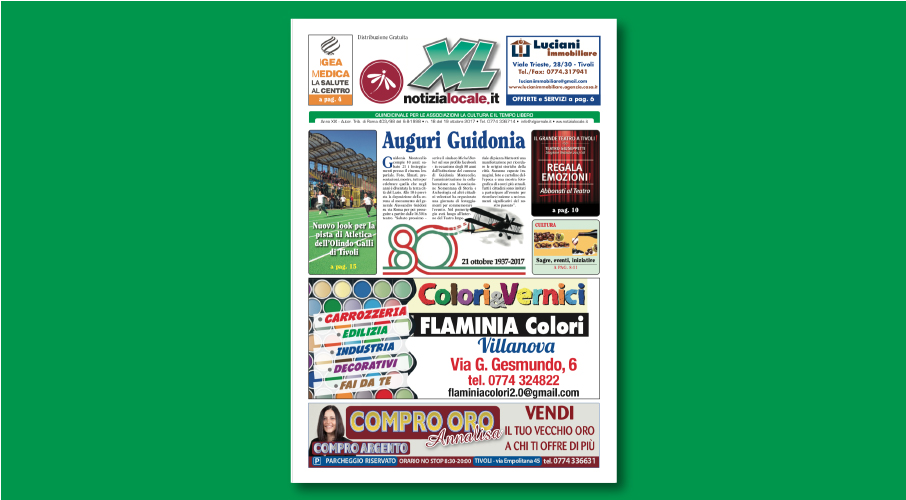 XL Giornale Online e Cartaceo (10.000 copie) nei nostri espositori a Tivoli e Guidonia il nuovo numero di XL GIORNALE • Guidonia compie 80 anni • SPORT Nuova pista di Atletica dell’Olindo Galli di Tivoli • Lavoratori RISP nulla di buono • CULTURA Sagre, eventi, iniziative, • Il Grande Teatro a Tivoli Sfoglia il giornale