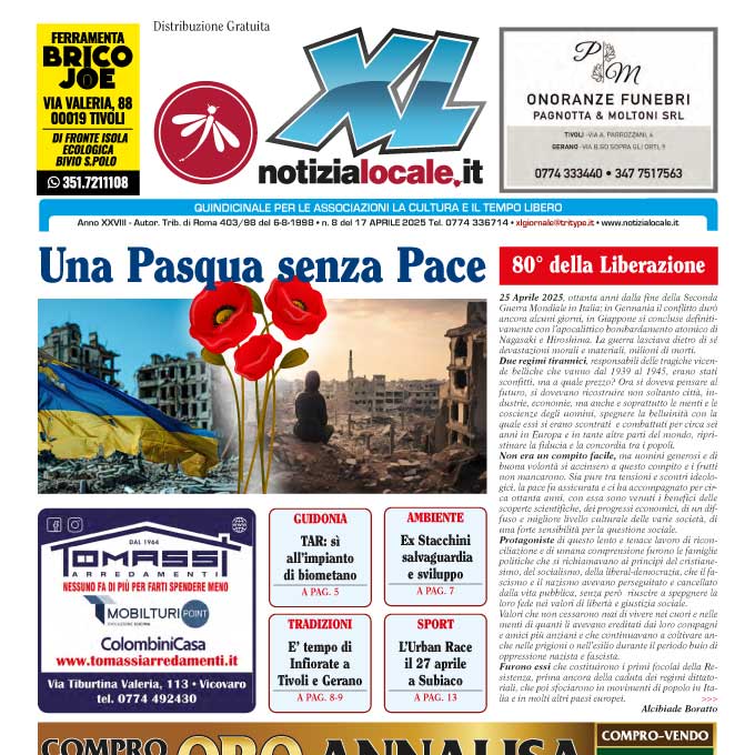 In questo numero: 25 aprile: gli 80 anni della Liberazione Guidonia: TAR: sì all’impianto di biometano Ambiente: Ex Stacchini, salvaguardia e sviluppo Tradizioni: È tempo di Infiorate a Tivoli e Gerano Sport: L’Urban Race il 27 aprile a Subiaco